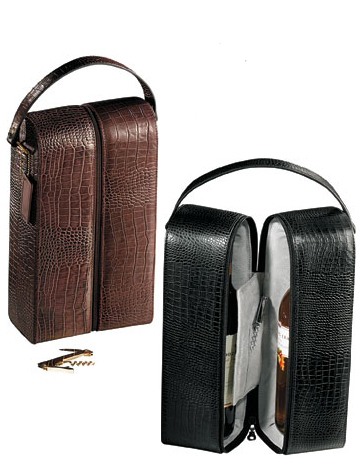 Product Description: Croco-grain cowhide, with a padded pigskin interior. A pocket holds a corkscrew/knife (included). The divider protects both bottles. Four metal feet for upright presentation. No personalization is available for this item.